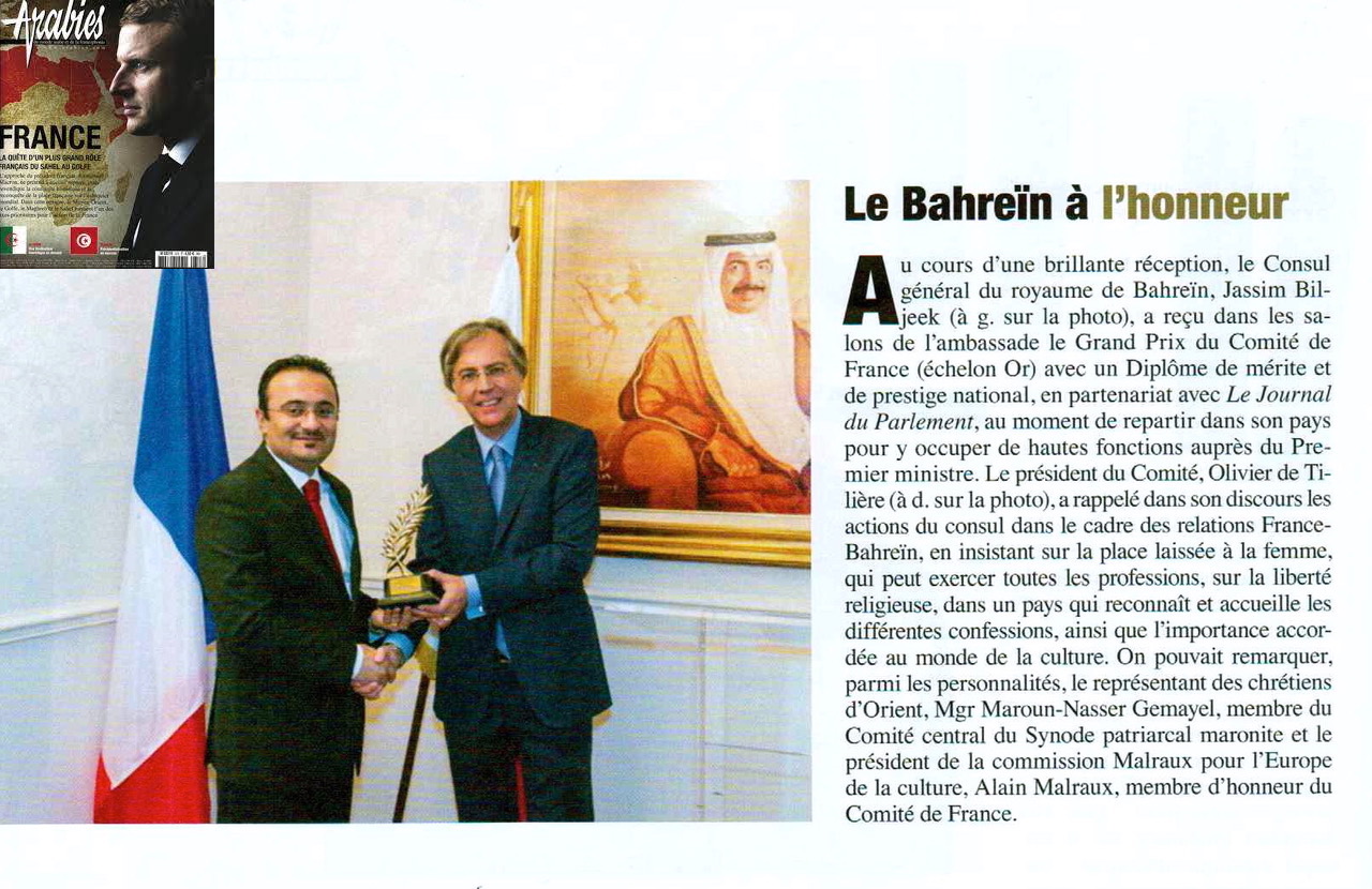 C’est à ce titre et au cours d’une brillante réception que le Consul Général du Royaume de Bahrein, Jassim Biljeek, a reçu dans les salons de l’Ambassade, le Grand Prix du Comité de France (échelon Or) avec un Diplôme de Mérite et de Prestige National au moment de repartir dans son pays pour y occuper de hautes fonctions auprès du Premier ministre.